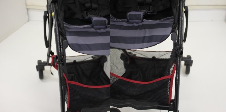 ママバッグや抱っこ紐を収納できる20Lの大容量カゴ。前からも後ろからも荷物が出し入れしやすい設計です。