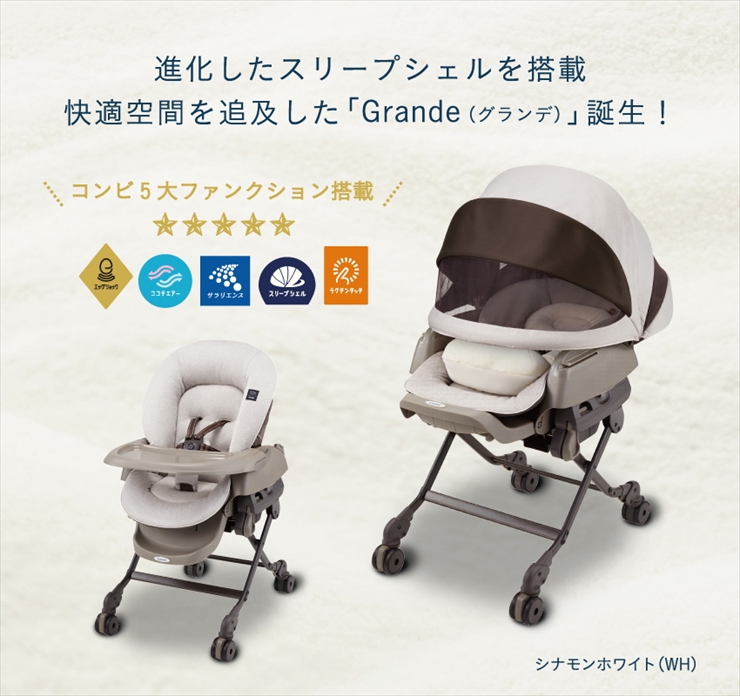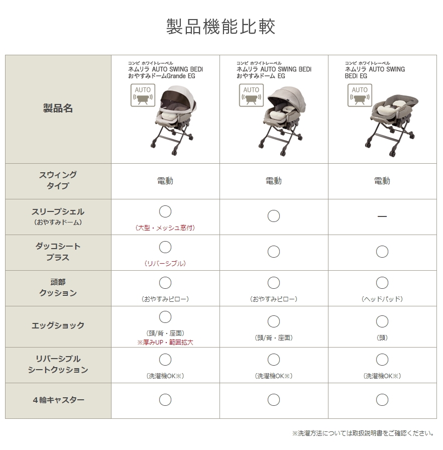 大人気のネムリラオートスウィングBEDiおやすみドームEGが更に進化した「おやすみドームGrande EG」。大きくなった幌(おやすみドーム)に、赤ちゃんの様子を確認できるメッシュ窓を搭載し、幌先端部は開閉音を抑えた静音仕様に。赤ちゃんに理想的な暗さと静かさを実現し多モードました。