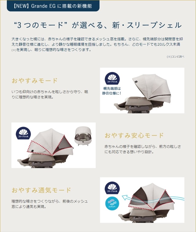 3つのモードが選べる、新・スリープシェル(遮光率99.9%、UPF50+、理想の暗さ20ルクス未満の幌)