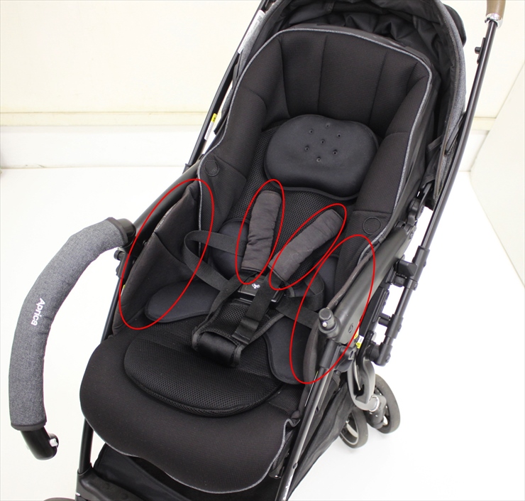 ・本体シートに目立つ汚れや色あせ、クッション性の低下は見受けられず、ご使用感の少ない状態ですが、両側の日の当たる部分に色あせがございます。(画像の丸印部分です。)