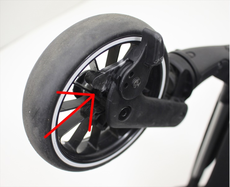 現状のままですと、キャスターロックを解除した状態でも、タイヤのホイールに少し触れてしまいます。(写真の矢印部分です。)