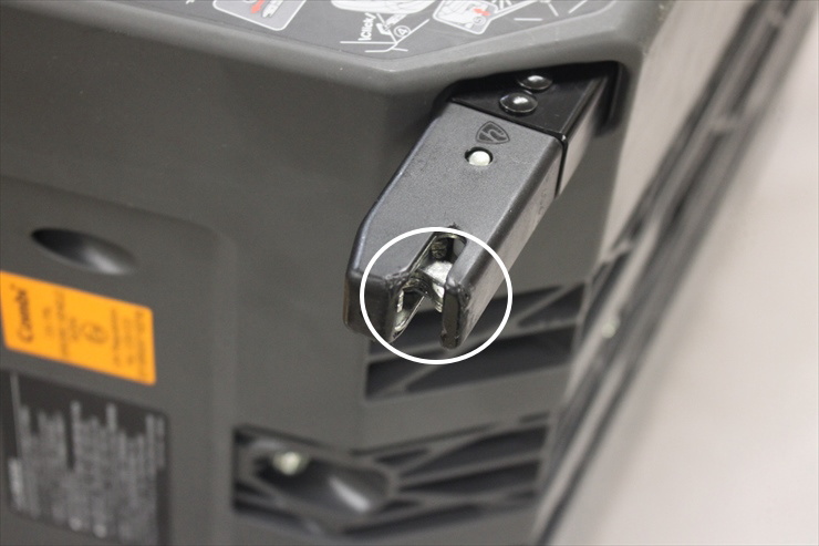 ・ISOFIXベースの向かって左側のISOFIXコネクターの接続部分(写真の丸印部分です)が固く、差し込む時に少し力がいります。また、コネクター解除レバーを操作して接続を解除する際も右側と比べて少し引っかかる状態です。取付け・取り外しはできますが現状でのお届けとなりますので、ご理解の上でご購入ください。