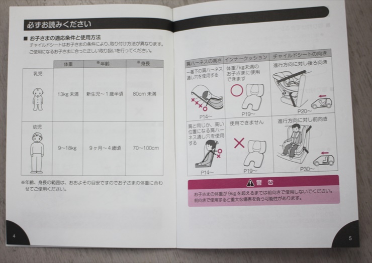 新生児~1歳半ごろ:後ろ向きにてご使用、9か月~4歳頃まで:前向きにてご使用