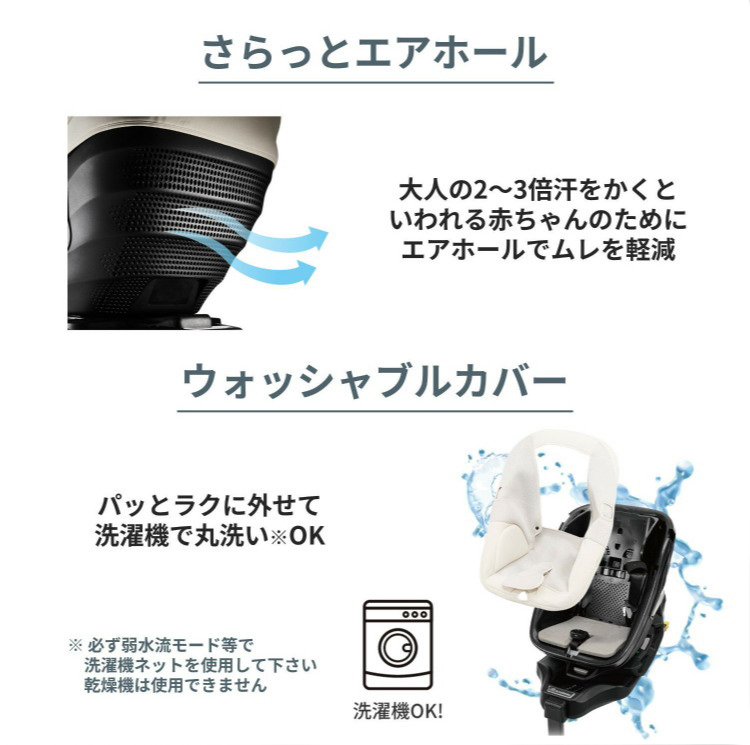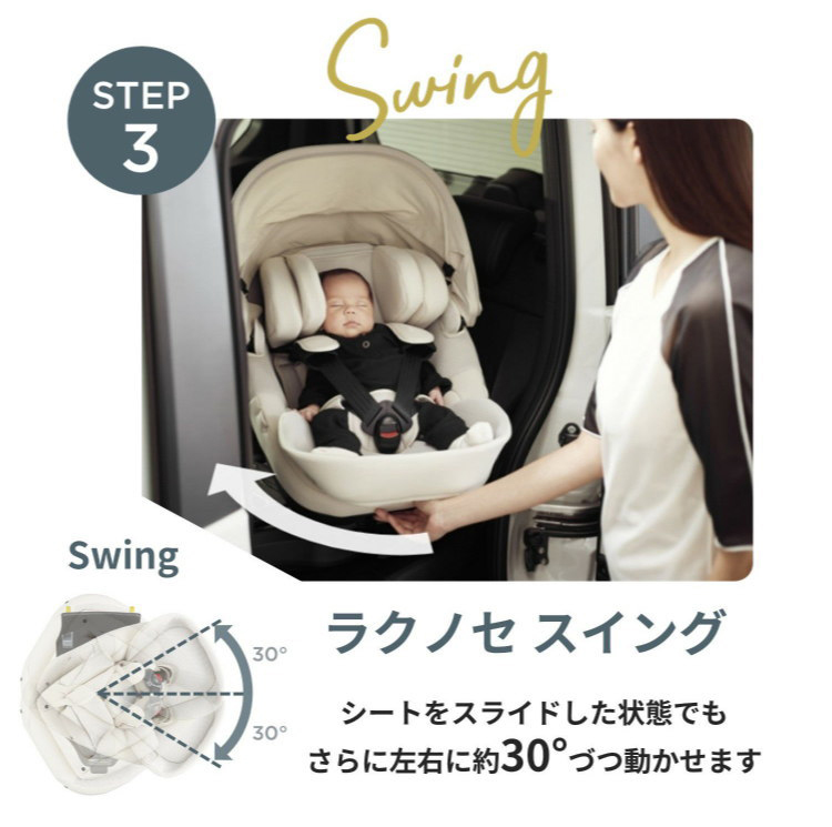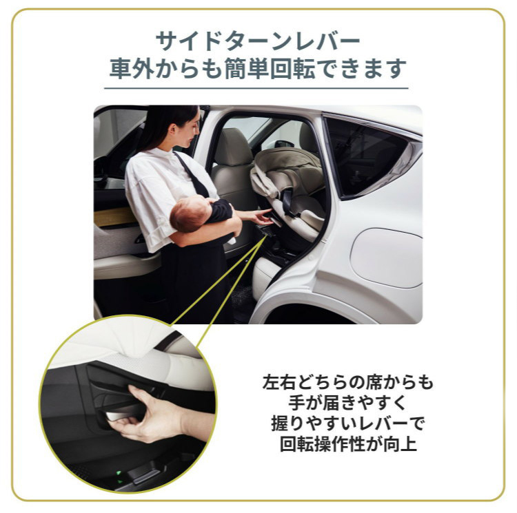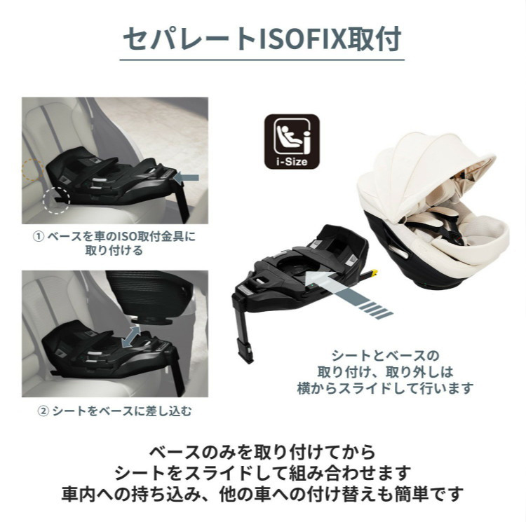新安全基準R129に適合した日本製のISOFIX取付専用チャイルドシートです。お子様の乗るシート部分とISOFIXベースが分離した「セパレートISOFIX取付」が採用されており、ベースのみを取り付けてからシートをセットすることができますので、大変取り付けがしやすくなりました。また、新機構「360°ターン&スライド+スイング」も採用され、乗せ降ろしの負担がより軽減される設計となっております。360°しっかり守られた空間となっており、新生児から安心してご利用頂けます。
