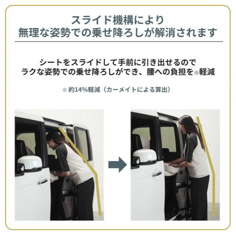 ・新機構の「ラクノセスライド」はシートがドア側に100mmスライド。さらにシートをスライドした状態でも左右に約30°ずつ動かすことができ、楽な姿勢での乗せ降ろしが可能。