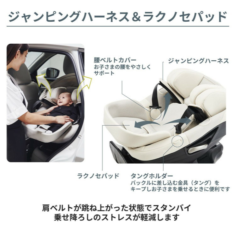 ・肩ベルトが跳ね上がり、お子さまの乗せ降ろしがラクになる「ジャンピングハーネス」&手前に倒れるバックルカバー「ラクノセパッド」