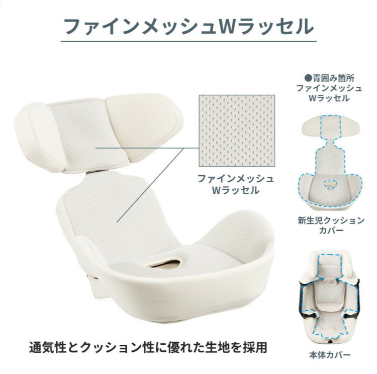 ・新生児クッション、本体カバーには、通気性とクッション性に優れたメッシュ生地「ファインメッシュWラッセル」を広範囲に使用。 従来よりも目が細かくなり、肌ざわりも優しくゴミなどが入りにくくなりました。