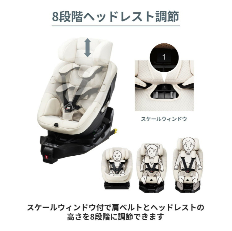 ・肩ベルト&ヘッドレストは8段階に高さ調節可能。段数が見えるスケールウインドウ付き。