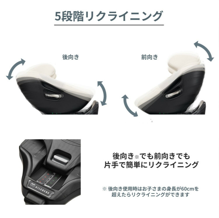 ・5段階リクライニング可能。(※後向き使用時はお子さまの身長が60cmを超えたら)