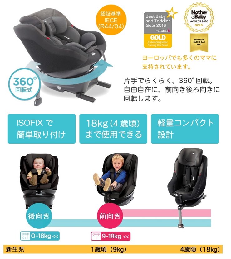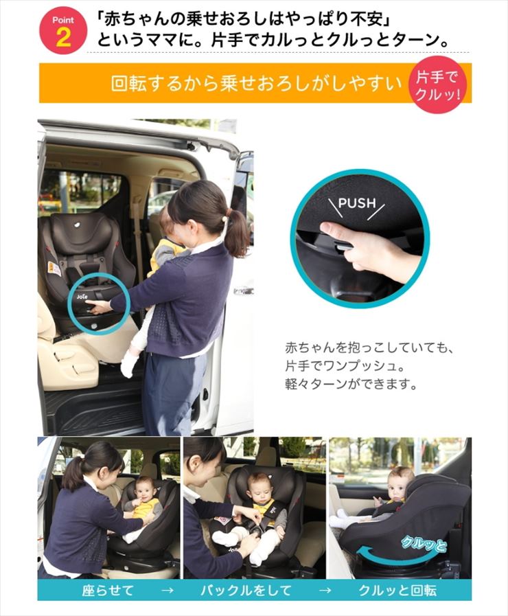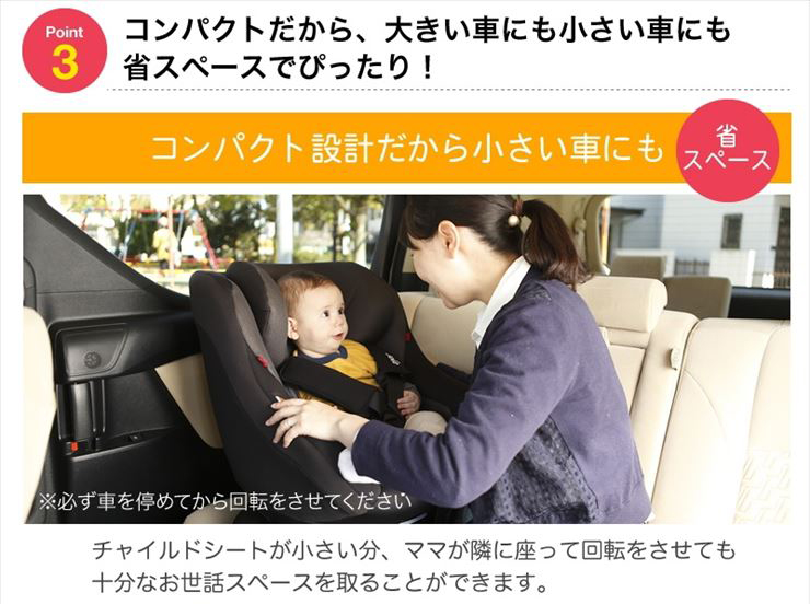 片手操作で360°ターンするので、乗せ降ろしもしやすくなっています。ISOFIX取付方式チャイルドシートの中では軽量コンパクトな設計で、軽自動車やコンパクトカーで利用しやすいと思います。GTモデルは上位モデルとなっており、ドア側から衝撃を軽減する「ガードサラウンドセーフティパネル」と、「回転ロック機能」が新たに搭載されています。