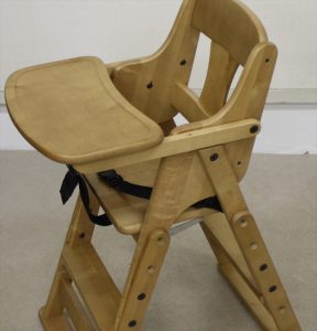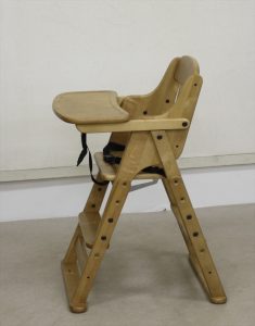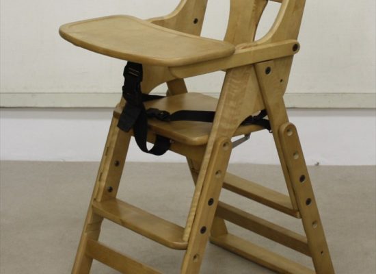 澤田木工所製の食事用の木製ハイチェアです。ワンタッチで折り畳めるので収納がしやすいのが特徴です。