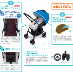 コンビの超軽量タイプのベビーカー「メチャカルハンディα」シリーズにオート4キャスシステムを搭載したモデルになります。オート4キャスシステムは、ベビーカーのハンドルを対面に切り替えた際に自動的に前輪側のタイヤが左右に動くように切り替わるシステムです。他にも、持ち運びやすい工夫や、片手で開閉操作が簡単な機能のようにママにやさしい機能はもちろん、赤ちゃんを振動から守る「振動レスシステム」、安心ハイシート(地上高55㎝)、UVカット素材の大きなサンシェードなど赤ちゃんにも優しい機能が満載です。