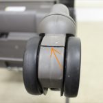 ・向かって左後輪のプラスチック部分(写真の矢印の部分です)に破損がございます。タイヤが外れるような箇所の破損ではなく、キャスターロックも効きますが、方向転換する際にタイヤが左右に回転しにくい状態です。現状でのお届けとなりますので、ご理解の上ご購入ください。