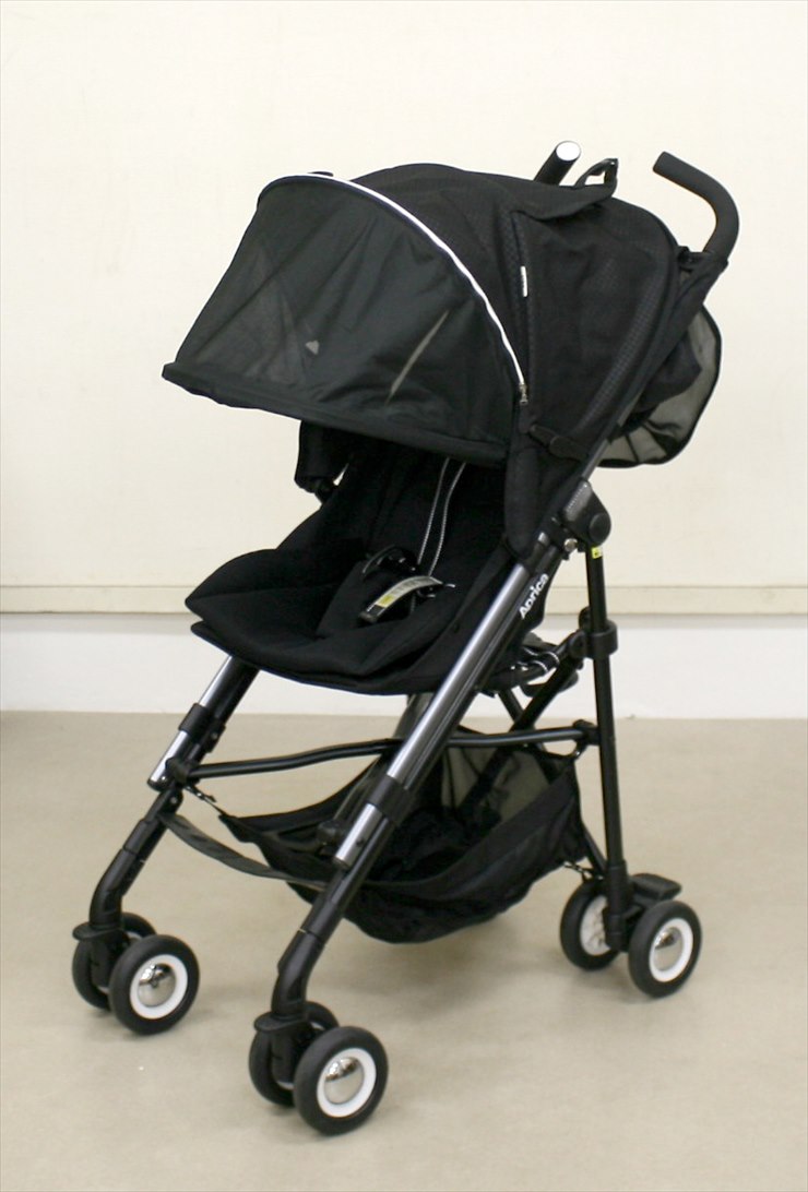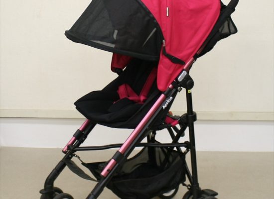 スティックはアップリカの背面固定タイプのA型ベビーカーです。こちらはリクライニング角度が最大140°のため、首据わり後からのご利用となります。背面固定ならではのかっちりとしたフレーム、ハンドルに加える力がスムーズにタイヤに届きますので軽い押し心地で操作できます。また、たたんだ時にA4サイズぐらいのスペースで収まる点がオススメです。