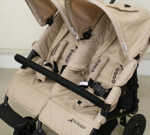 エアバギーの2人乗り背面式ベビーカー。双子だけでなく年齢の近い兄弟にも使用でき、左右のシートは別々にリクライニングが可能。