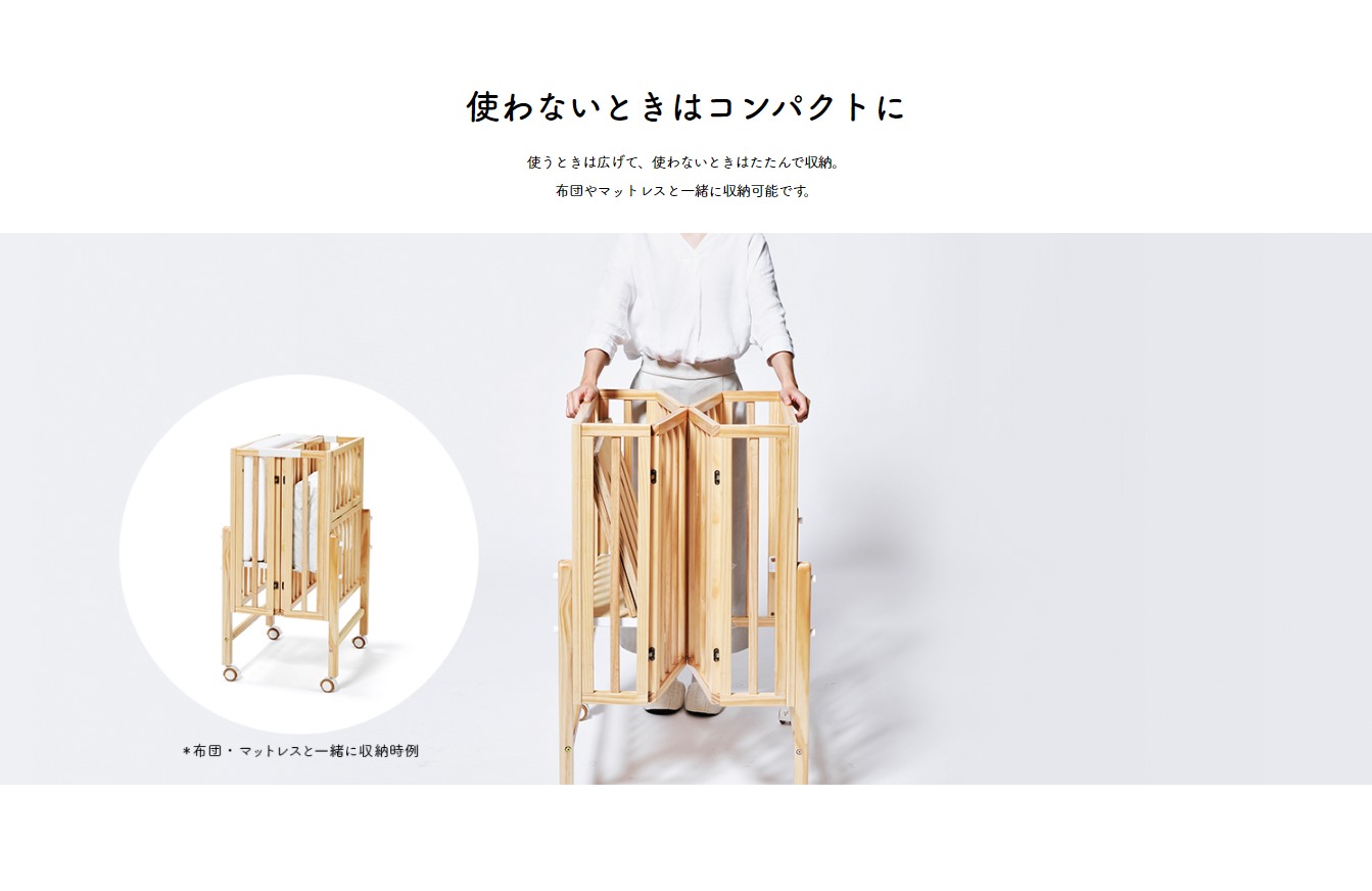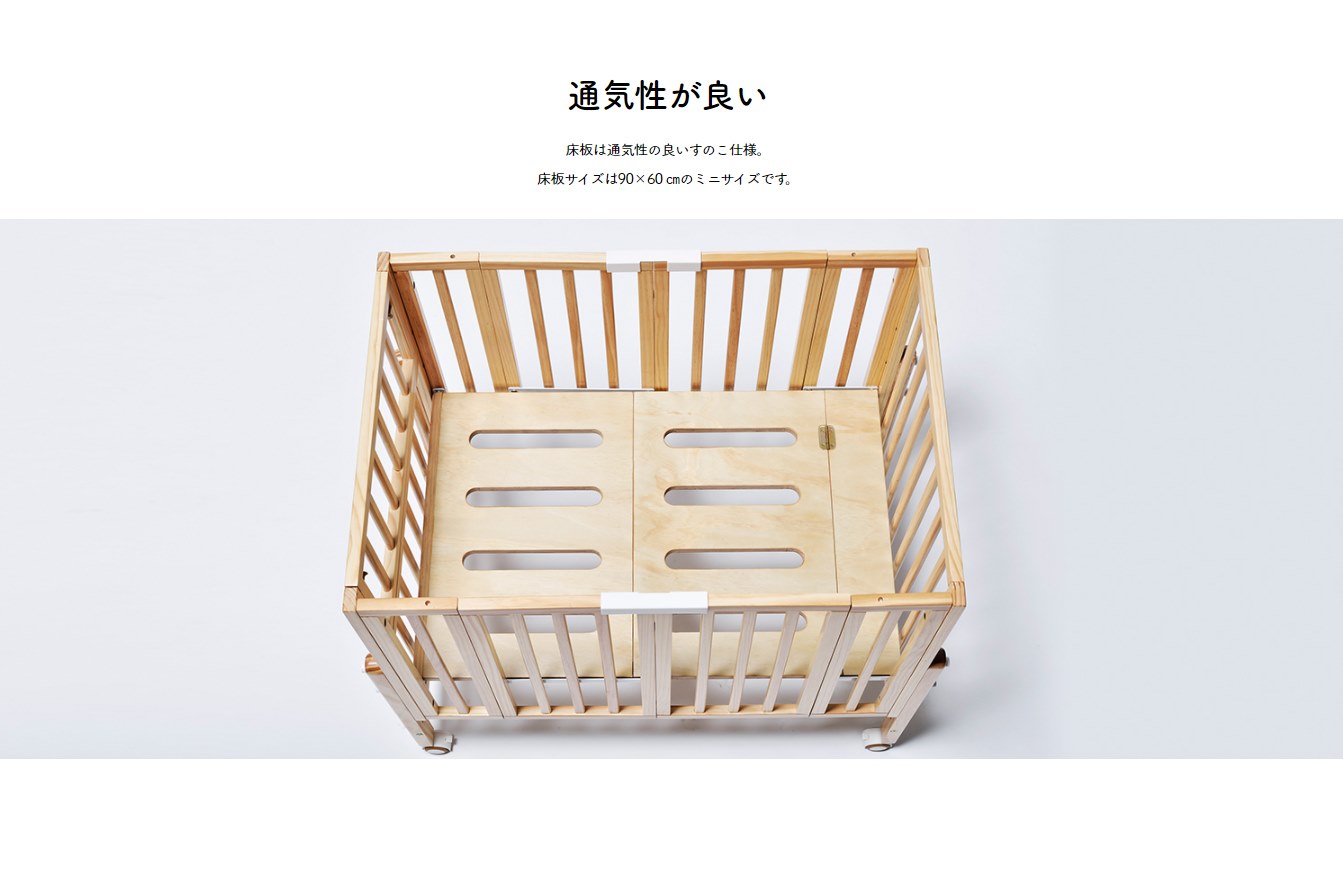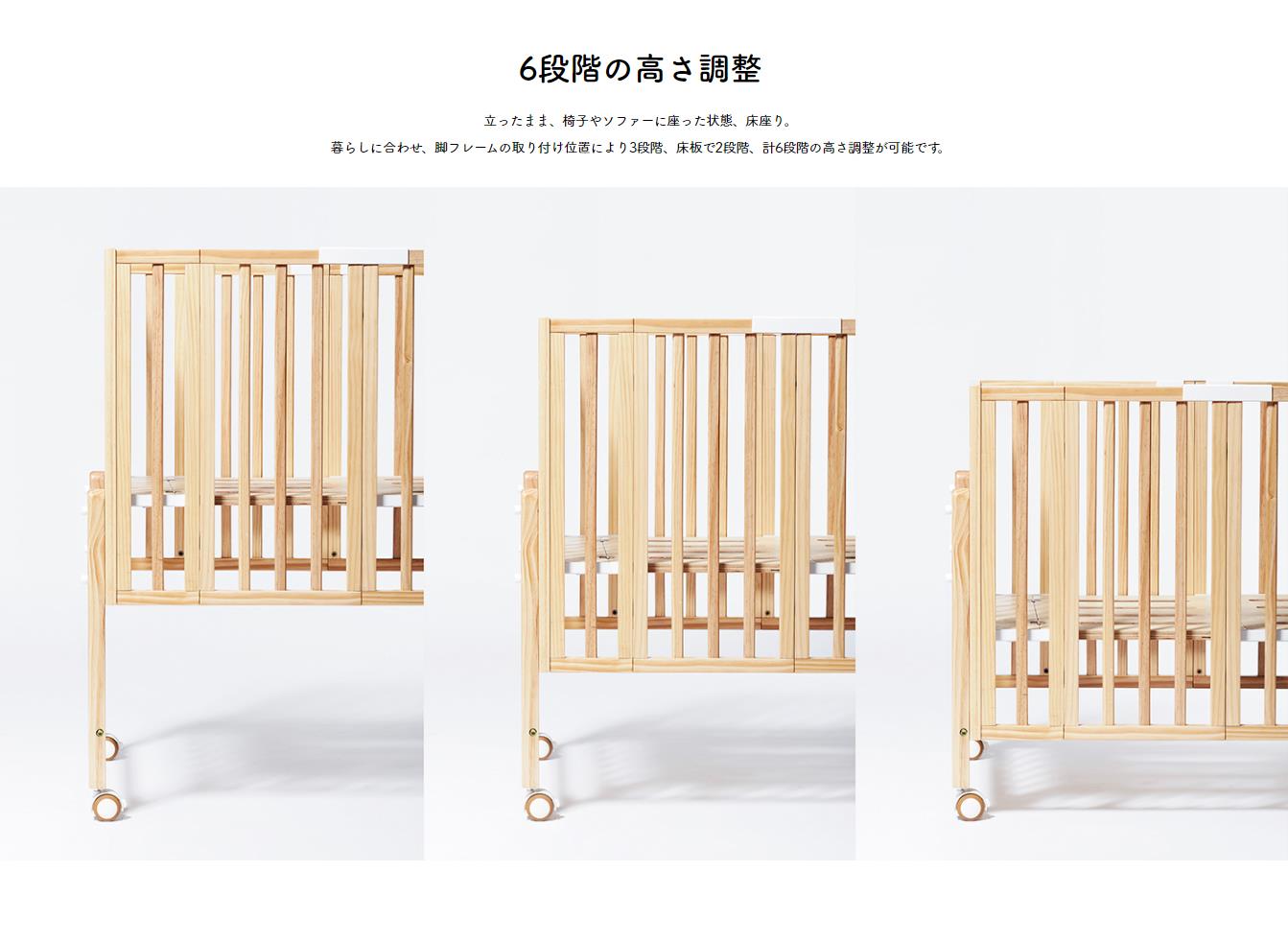 使わない時は簡単に折りたためる木製ベビーベッドです。脚フレームと床板で6段階の高さ調整が可能なので、使い方や状況に合わせ、無理のないお世話が可能に。床板は、通気性の良いすのこ仕様となっております。