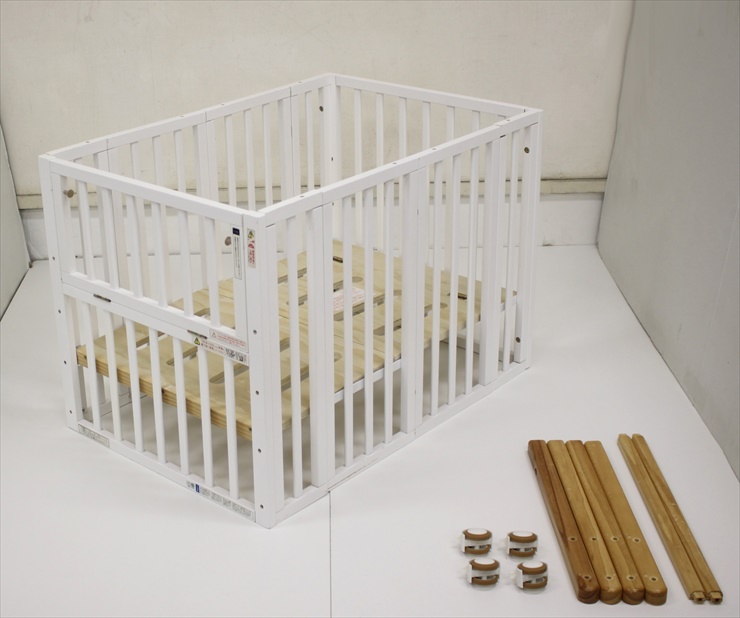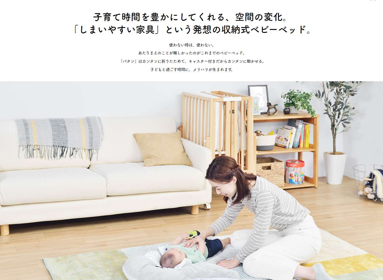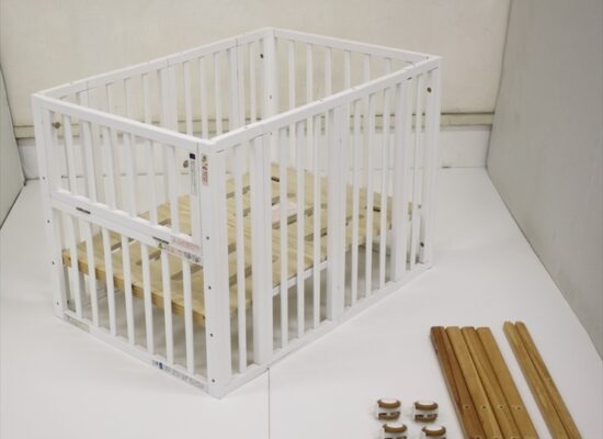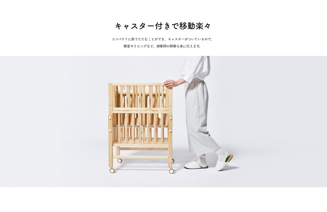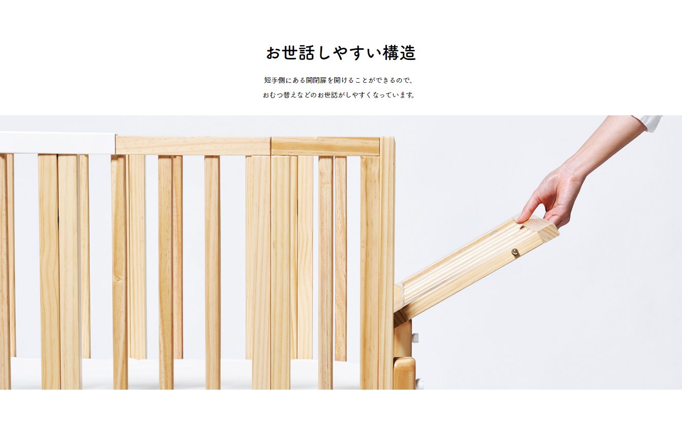 使わない時は簡単に折りたためる木製ベビーベッドです。脚フレームと床板で6段階の高さ調整が可能なので、使い方や状況に合わせ、無理のないお世話が可能に。床板は、通気性の良いすのこ仕様となっております。