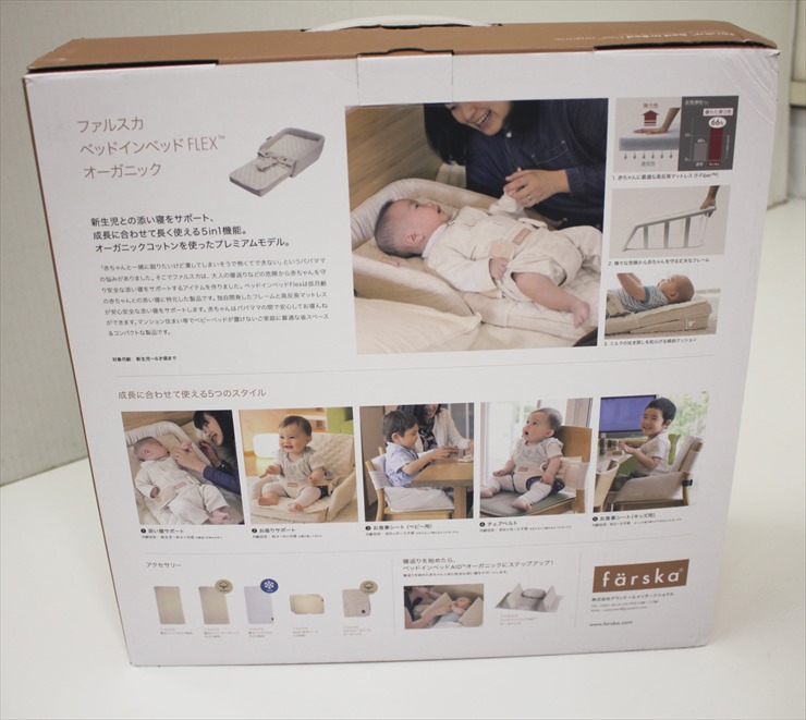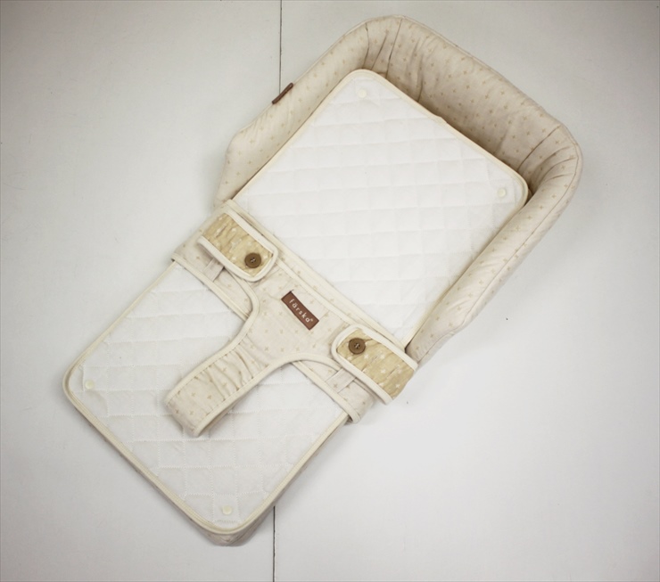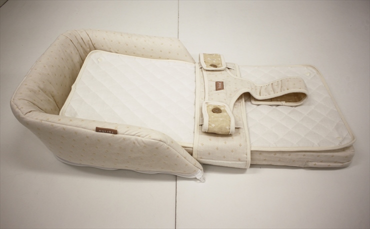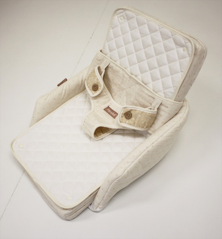 新生児から4ヵ月頃までの赤ちゃんとの安全な添い寝をサポート。添い寝サポート以外でも、成長に合わせて形を変えて使えます。腰が座ってきたらお座りサポートとして、椅子に座れるようになったらお食事シートとして使うことができます。お肌に優しいオーガニック素材のモデルです。