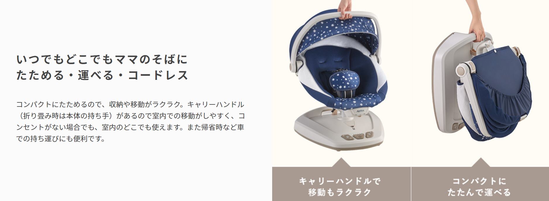 ハイローベッドでもない、バウンサーでもない新しい電動タイプのポータブルスウィング「スマート スウィング プラス」。たためる、運べる、コードレスで、リビングや寝室など、いつでもどこでも赤ちゃんの「入眠」、「あやし・落ちつかせ」をサポートします。かわいいクマさんのお耳付きヘッドクッションや、ぶらさがりトイも付いていて、赤ちゃんも楽しく過ごせます。