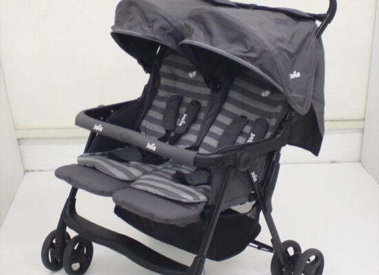 ジョイーの横並び二人乗りベビーカーです。リクライニング・フットレスト・幌がそれぞれ調節可能で、使いやすい!収納カゴも二人乗りベビーカーならではの大容量、ネットの高さも充分です。折りたたんでも自立するので収納にも困りません。