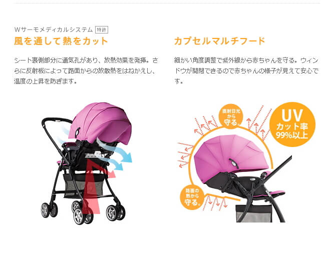 アップリカの軽量・両対面タイプのベビーカーです。座席の位置が高く、アスファルトの熱の影響を受けにくいモデルになっています。対面の状態でも自然に操作できるオート4輪機能付きです。