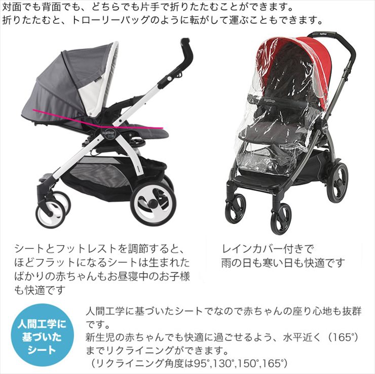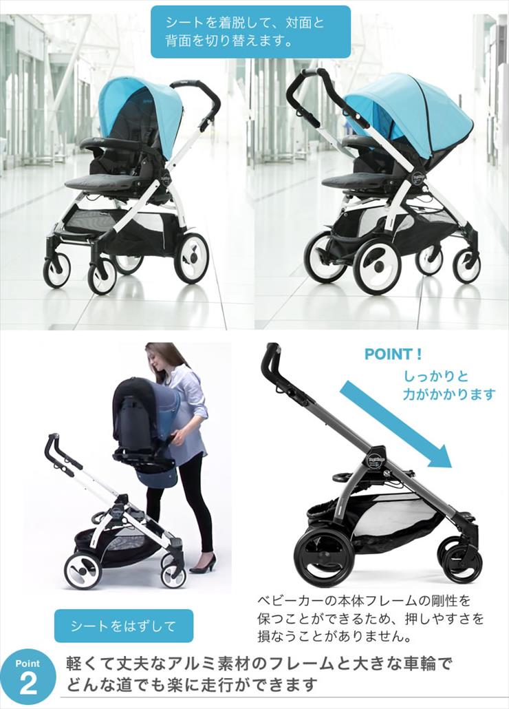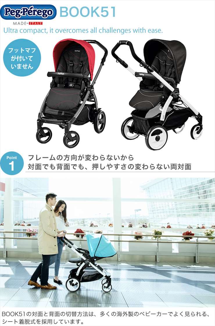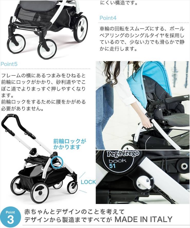 イタリアのメーカーPeg-Peregoの両対面ベビーカー「Book51」になります。新生児から使用できます。かっちりとしたフレーム、大きいシングルタイヤで石畳などでの走行も快適です。