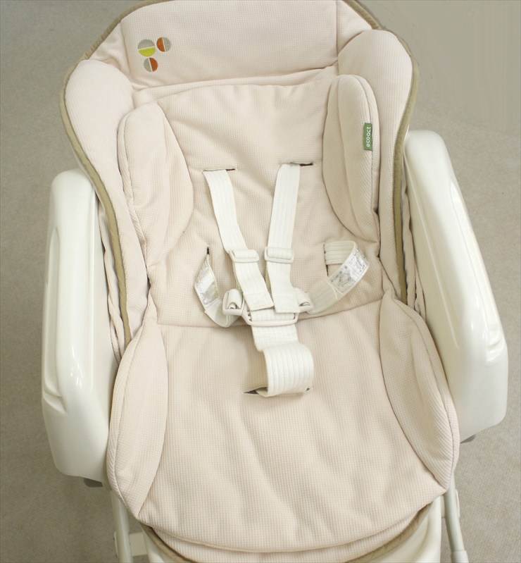 コンビの電動タイプのハイローチェアです。速乾性のあるさらっとしたシートが2枚重ねになっています。