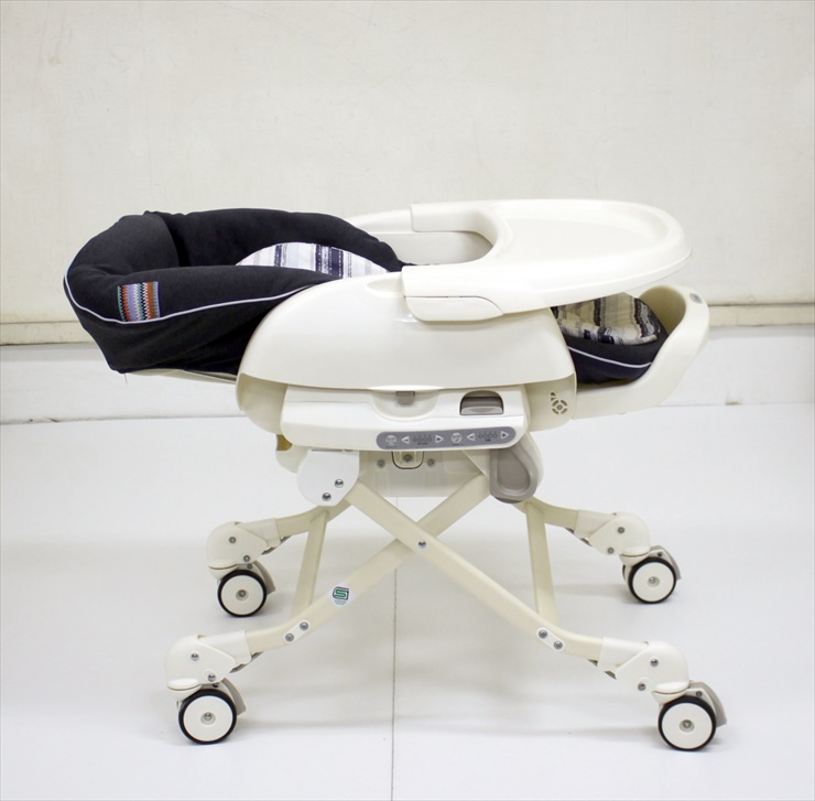 コンビの手動のハイローチェアで、アカチャンホンポ限定モデルです。小回りが利かせやすい4輪キャスター、吸湿速乾素材のインナークッション「コンフォートドライシート」が追加されて、より使いやすく進化したモデルです。