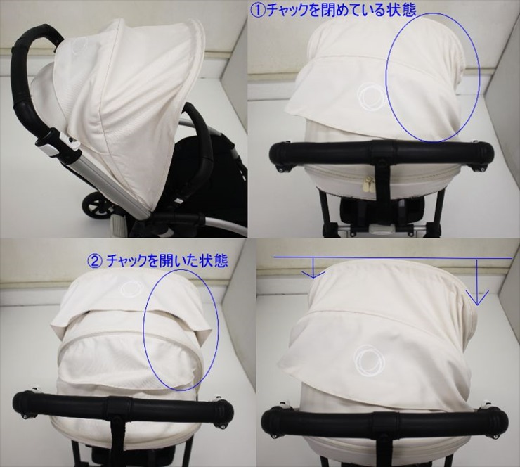 ・幌のアジャスターが少し緩くなっている様で、幌のチャックを閉めている時に幌を開こうとすると、幌の片方が少しだけ開き切らない状態です。(幌画像①の青い丸印部分をご確認ください。)