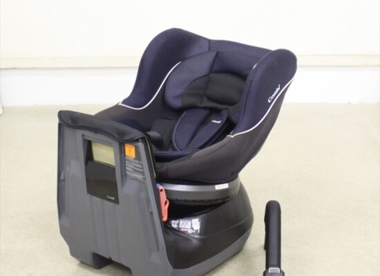 コンビの360度回転タイプの車両シートベルトで固定するチャイルドシートです。こちらは西松屋モデルになります。赤ちゃんの乗せ降しの際にチャイルドシート本体を回転させることで楽な姿勢で乗せ降しができます。回転操作は片手でチャイルドシート正面の操作部分で行うことができます。また、リクライニング操作も片手ワンタッチで操作ができます。
