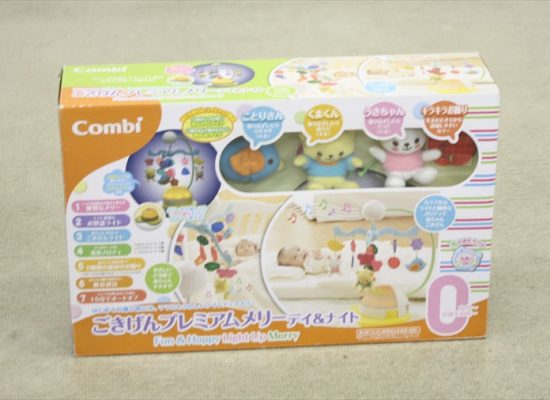 ベッドへの取り付けと床置きの2wayで使えるメリーです。さらに5段階で調光できるライト付きで、夜間のお世話にも便利です。下飾り人形は、肌にやさしいふわふわ素材で、取り外してラトルとしても遊べます。